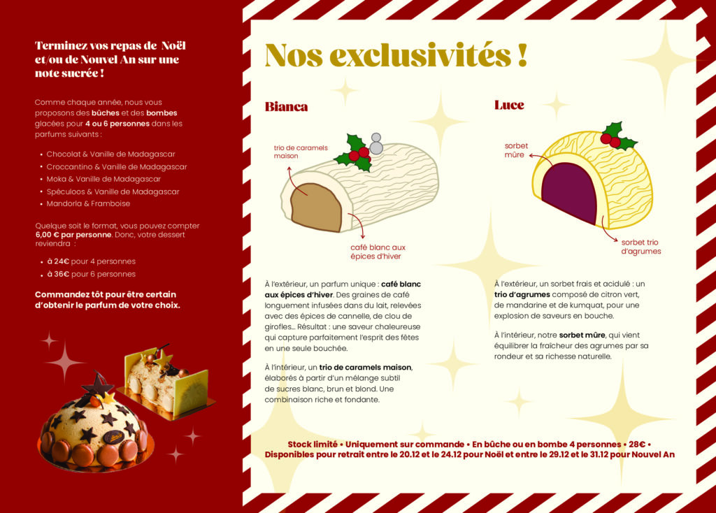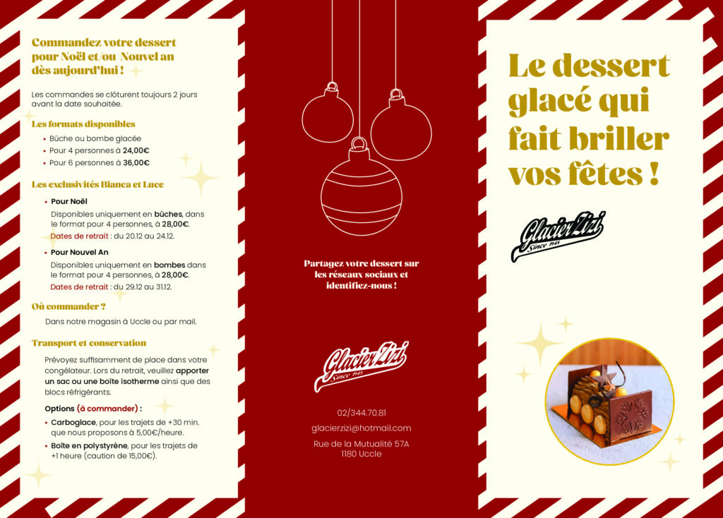 Commandez dès aujourd'hui votre bûche ou bombe glacée pour les fêtes de fin d'année. Consultez notre flyer et découvrez les disponibilités. Pour passer commande ou pour plus d'informations, n'hésitez pas à nous envoyer un mail ou à venir sur place dans notre établissement situé à Uccle.